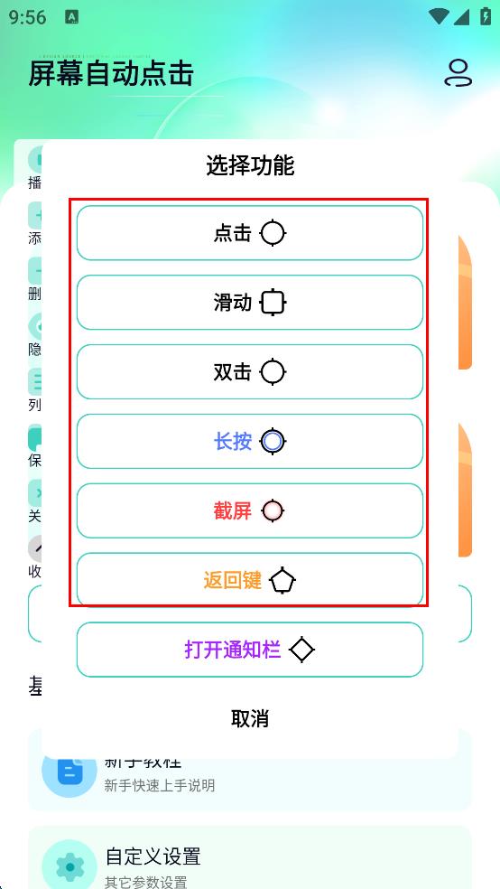 4、在“選擇功能”窗口中,有“點擊”“滑動”“雙擊”“長按”“截屏”“返回鍵”等多種功能選項,根據(jù)需求點擊相應(yīng)的功能選項即可完成選擇。