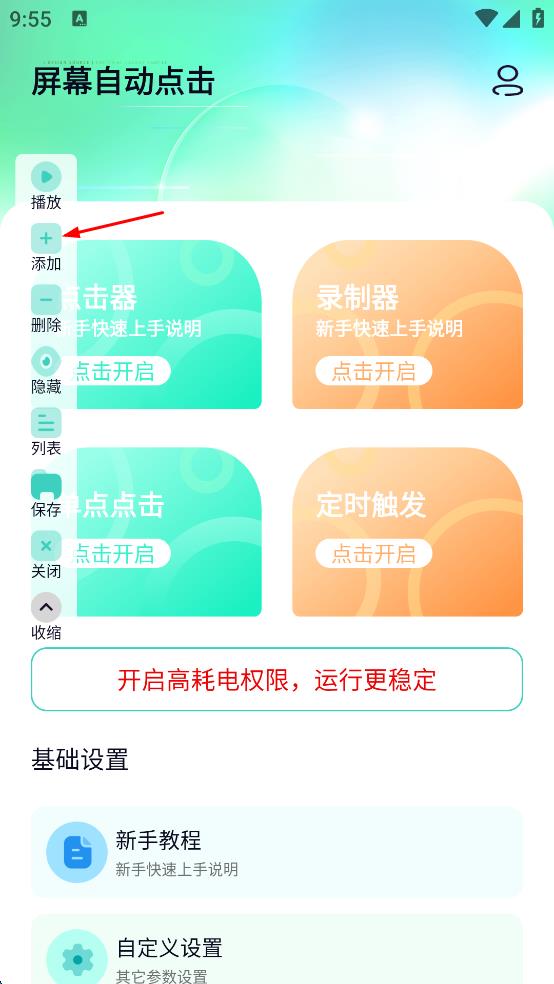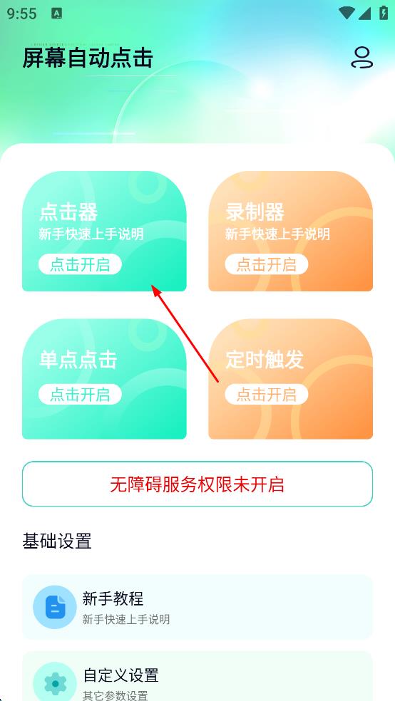 2、進入屏幕自動點擊主界面后,在界面中找到“點擊器”區(qū)域,點擊“點擊開啟”按鈕,此時會彈出相關(guān)操作選項欄。