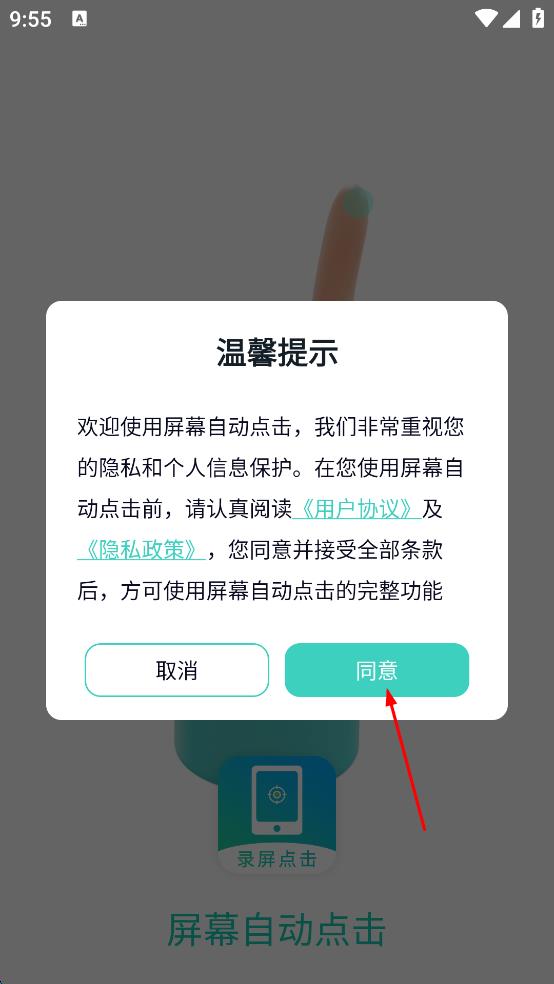 1、打開屏幕自動點擊app,在彈出的溫馨提示界面,找到“同意”按鈕,點擊該按鈕。