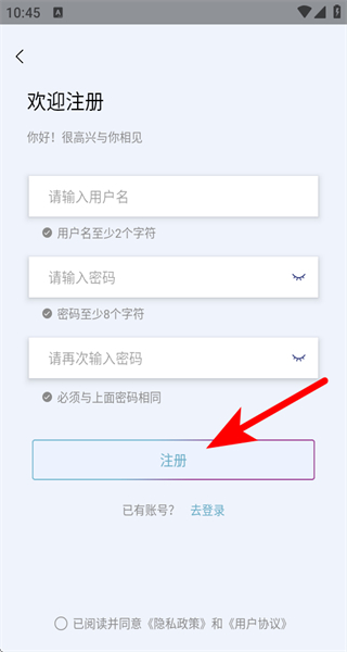 4、在頁面填寫用戶名等信息后,點擊注冊,完成賬號注冊。