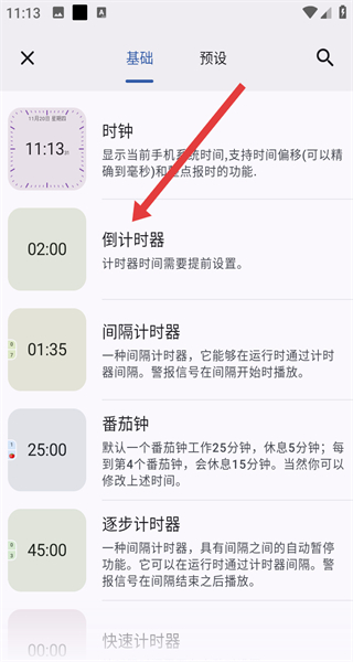 3、在計時器選擇界面,點擊倒計時器選項,進入倒計時器設(shè)置界面。