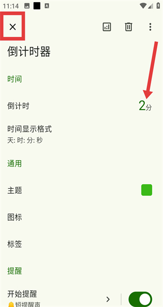 4、在設(shè)置倒計時時間等參數(shù)后,點擊左上角的X按鈕,保存并退出,完成倒計時器的添加操作。