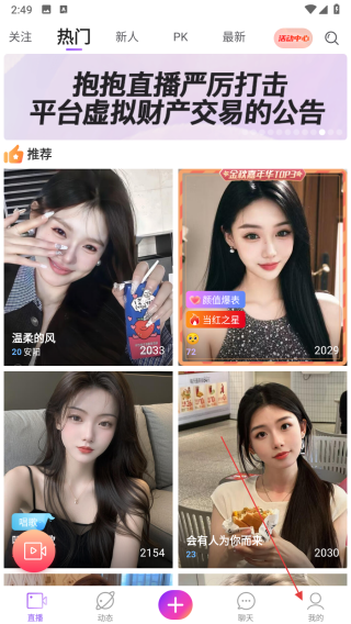 1、打開抱抱直播APP,點擊界面右下角我的,進入個人頁面。