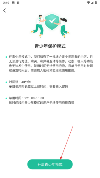 4、在青少年保護模式介紹頁面,點擊底部的開啟青少年模式按鈕,即可開啟青少年模式。
