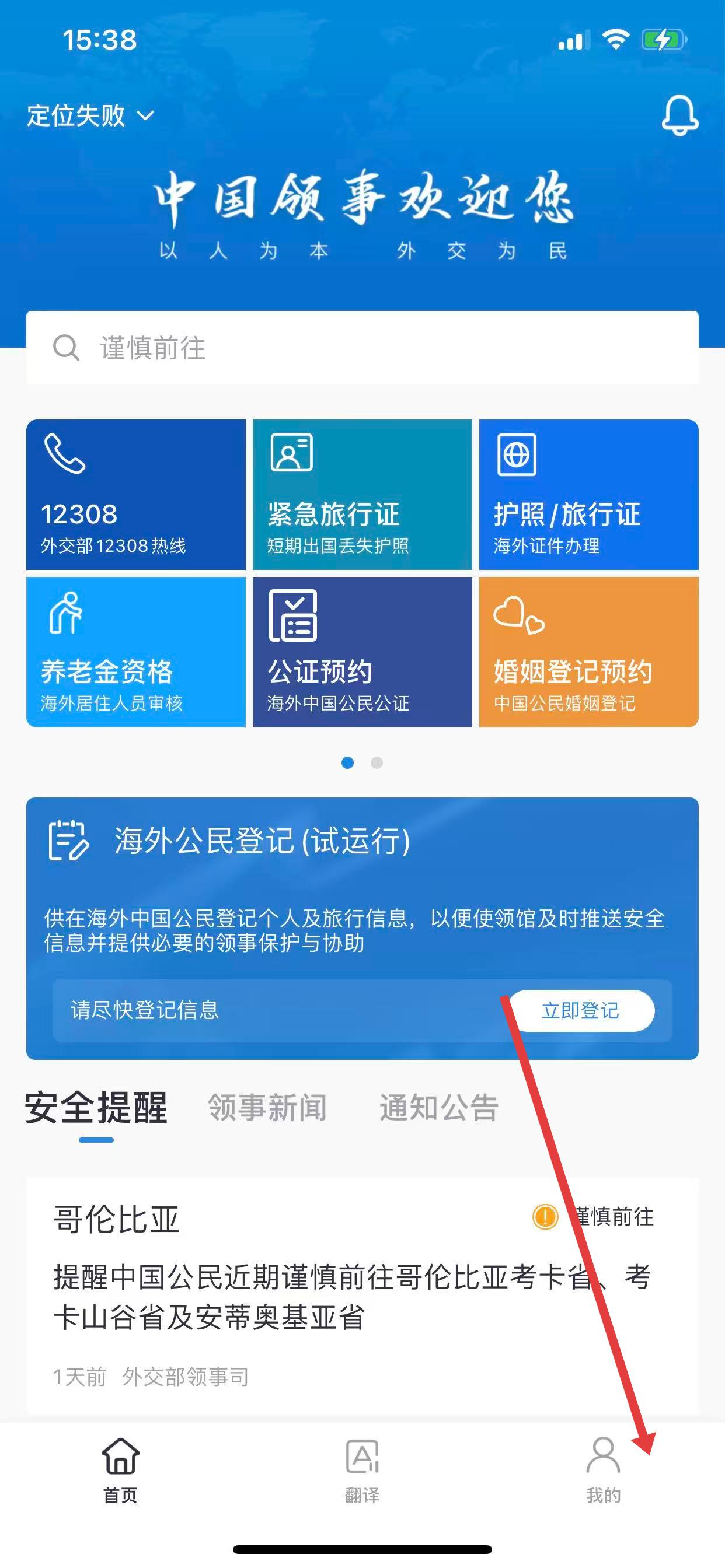 1、打開中國領(lǐng)事APP,點擊底部導航欄中的我的。