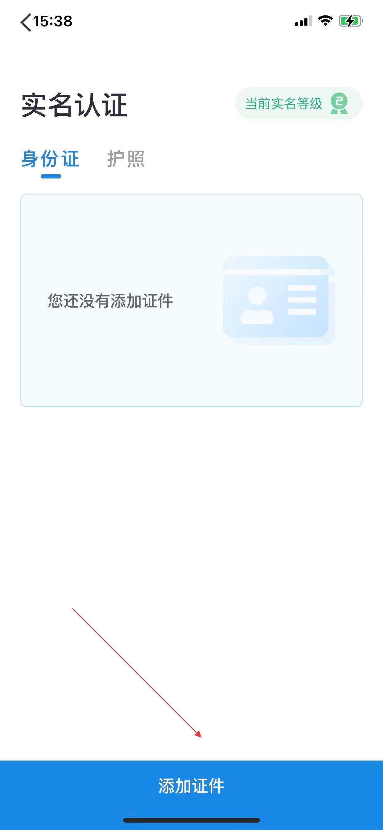 3、進入實名認證界面,選擇身份證,點擊下方添加證件。