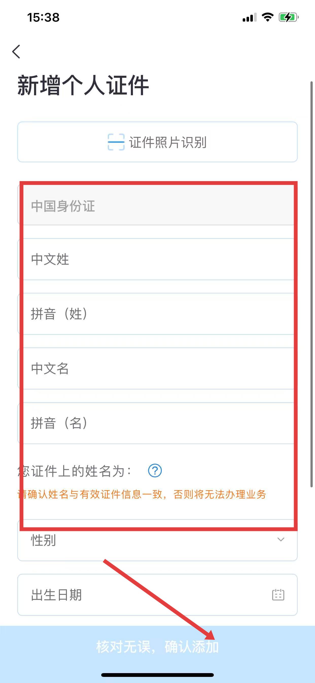 4、填寫相關(guān)身份信息,點擊核對無誤,確認添加,完成實名認證。