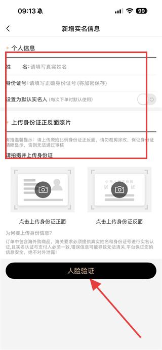4、在新增實(shí)名信息頁(yè)面,填寫(xiě)個(gè)人姓名、身份證號(hào),上傳身份證正反面照片,完成后點(diǎn)擊人臉驗(yàn)證按鈕,即可完成實(shí)名認(rèn)證操作。