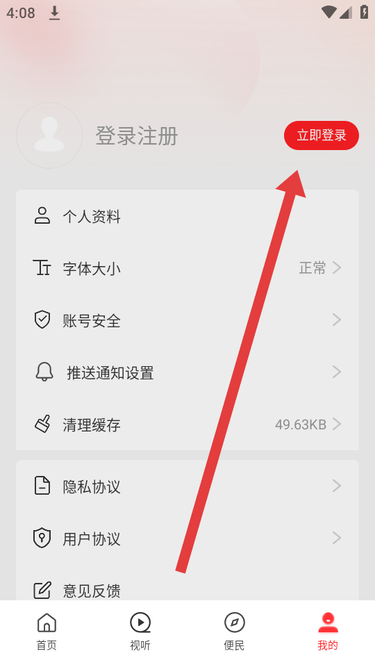 1、打開云上獲嘉APP,點擊底部導航欄的我的進入個人頁面,再點擊頁面右上角紅色的立即登錄按鈕,進入登錄界面。