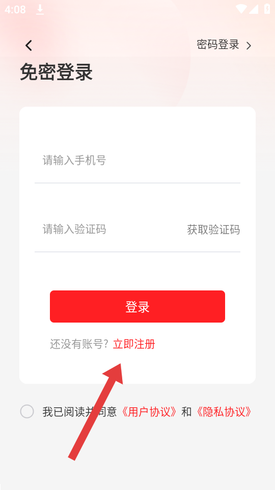 2、在登錄的界面免密登錄頁,點擊還沒有賬號,立即注冊的紅色文字鏈接,跳轉(zhuǎn)至注冊頁面。