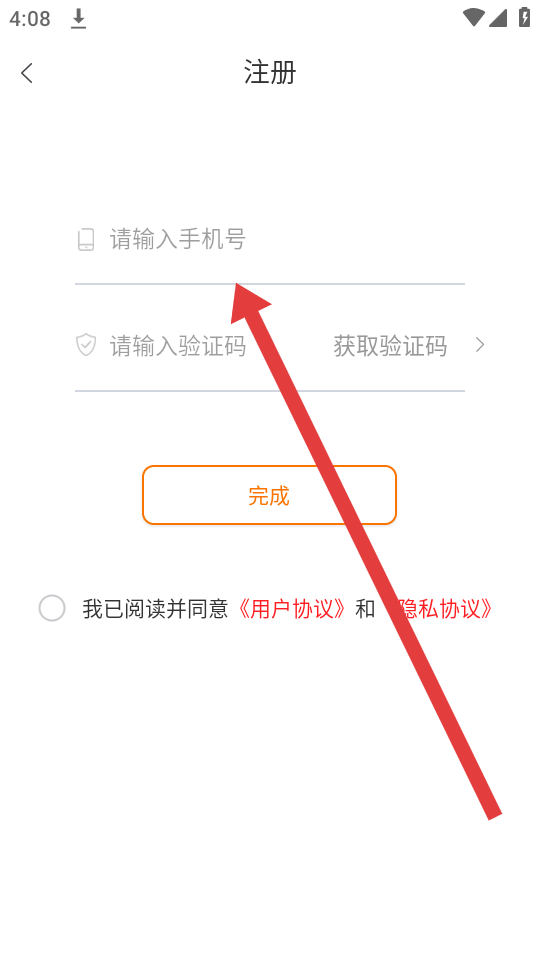 3、在注冊頁面,依次輸入手機號碼,點擊獲取驗證碼并填寫收到的驗證碼,勾選我已閱讀并同意協(xié)議,最后點擊完成按鈕,即可完成注冊。