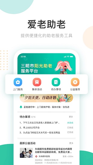 陽光助老是一款專門針對老人養(yǎng)老開發(fā)的軟件,通過大數(shù)據(jù)分析系統(tǒng)上采集了大量的老年人信息,更加方便的觀測他們的健康狀態(tài)。平臺面還有著專業(yè)的工作人員他們還可以上門一對一服務(wù)老年人。平臺上面還組織免費的公益活動不定時的為老人檢查身體。非常實用的軟件快為家人下載試試吧。