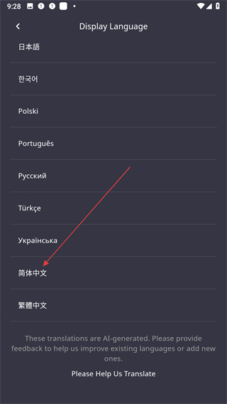 3、在語言設(shè)置界面,找到簡體中文選項(xiàng),點(diǎn)擊簡體中文選項(xiàng)進(jìn)行選擇,等待系統(tǒng)完成語言切換指令接收。
