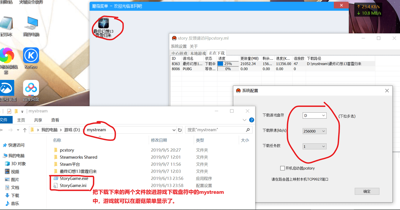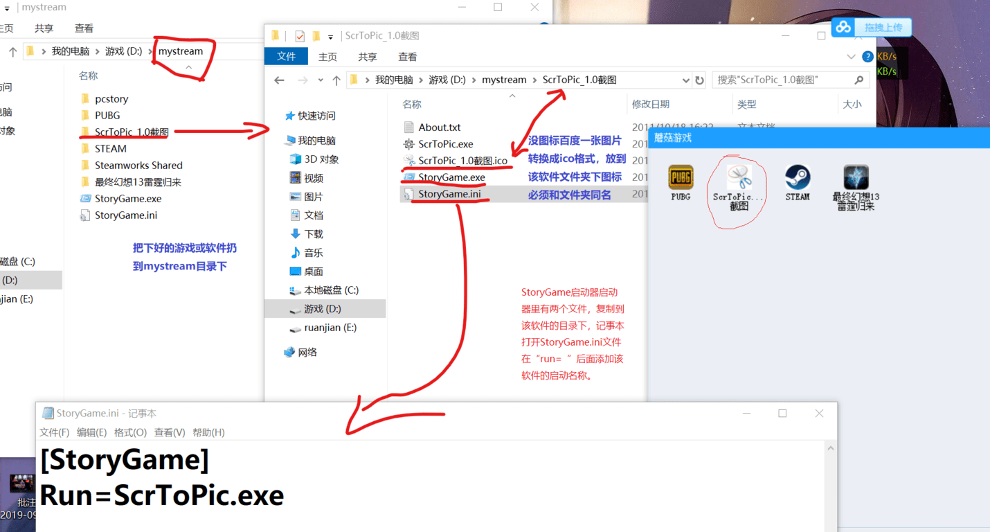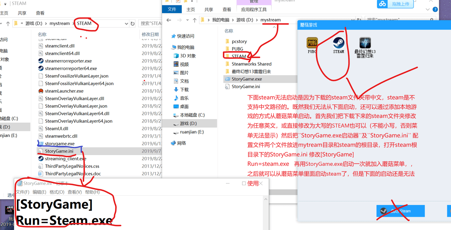 把中文文件夾先改成大寫的STEAM(不能小寫),然后把下載的StoryGame啟動器里的兩個文件復制到改好了的STEAM文件夾下,用記事本打開剛剛復制進去的StoryGame.ini文件在“Run=”后面加入“Steam.exe”(即"Run=Steam.exe")關(guān)閉保存,就把steam添加到了蘑菇游戲菜單里了,我們就可以從游戲菜單里啟動。