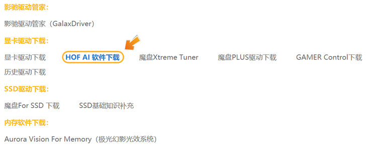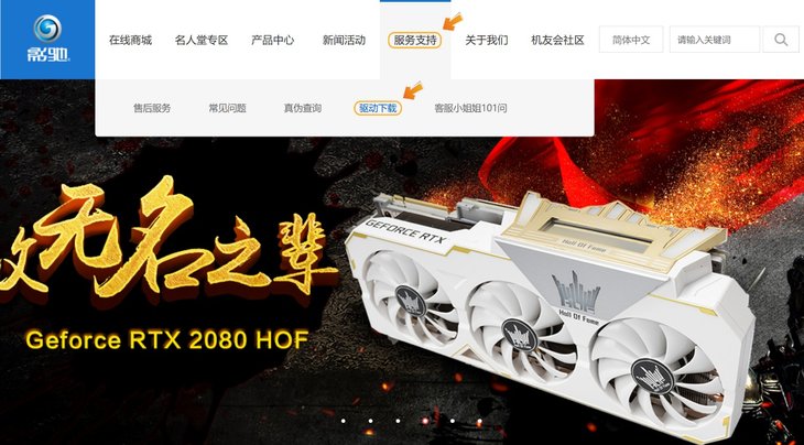 首先,我們需要進(jìn)入影馳官網(wǎng)下載 HOF AI軟件,點(diǎn)擊【服務(wù)支持】→【驅(qū)動(dòng)下載】。