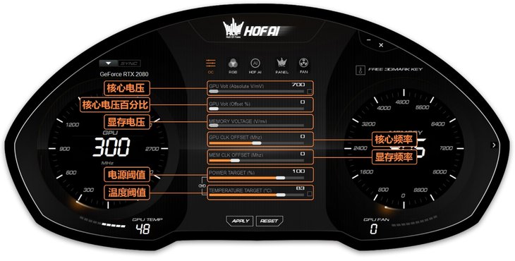 HOF AI支持的功能十分豐富,首先簡(jiǎn)單介紹一下HOF AI支持的5大功能:①顯卡超頻設(shè)置 ②顯卡燈效調(diào)控 ③顯卡運(yùn)作模式 ④ 顯卡屏幕顯示 ⑤風(fēng)扇轉(zhuǎn)速自定義