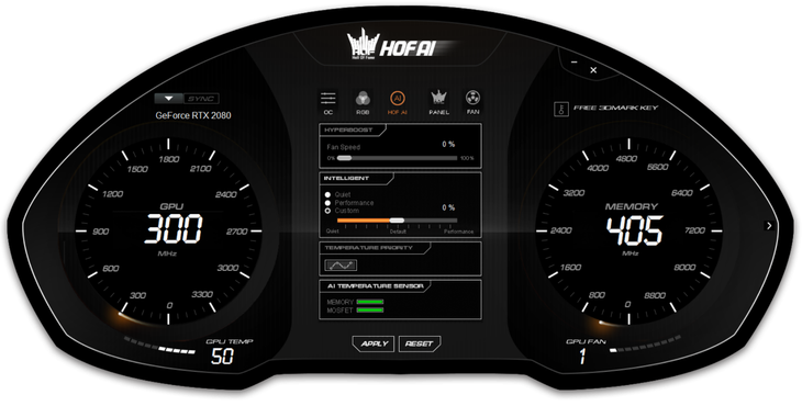Intelligent模式能讓用戶(hù)簡(jiǎn)易調(diào)整風(fēng)扇特性。以往的OC軟體,用戶(hù)只能設(shè)定固定風(fēng)扇轉(zhuǎn)速,或進(jìn)行復(fù)雜的自訂風(fēng)扇曲線圖。在HOF AI下,用戶(hù)要改變風(fēng)扇特性,只需簡(jiǎn)單使用HOF AI的Intelligent模式。模式預(yù)設(shè)提供Quiet (寧?kù)o)及Performance(性能)選項(xiàng),能分別提供比默認(rèn)更寧?kù)o及更佳散熱效果(詳細(xì)見(jiàn)上表測(cè)試)。另外用戶(hù)也可自定義風(fēng)扇傾向安靜或性能,幅度由0-50%。