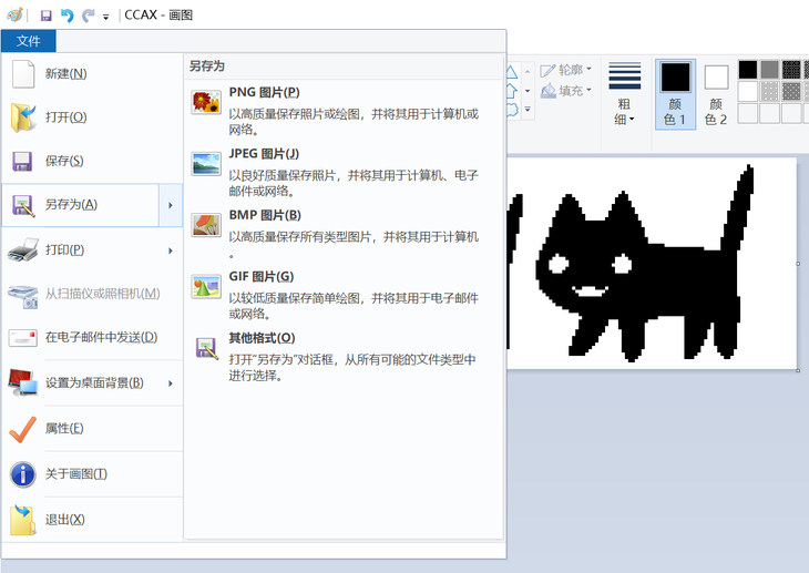 利用畫(huà)筆等工具,創(chuàng)造出自己專(zhuān)屬的創(chuàng)意圖片(PS:這里是小編自己畫(huà)的貓......),最后導(dǎo)出格式選擇【BMP】即可使用。