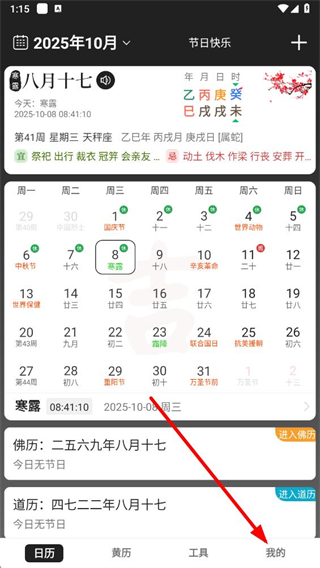 1、打開中智萬年歷app,點(diǎn)擊底部導(dǎo)航欄中的我的選項(xiàng)。