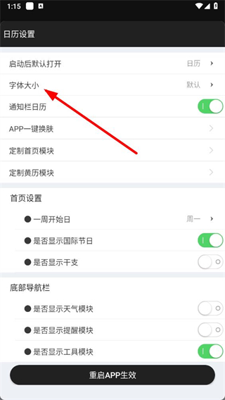 4、在日歷設(shè)置頁面,找到字體大小選項(xiàng),點(diǎn)擊進(jìn)入并按照需求調(diào)整字體大小。