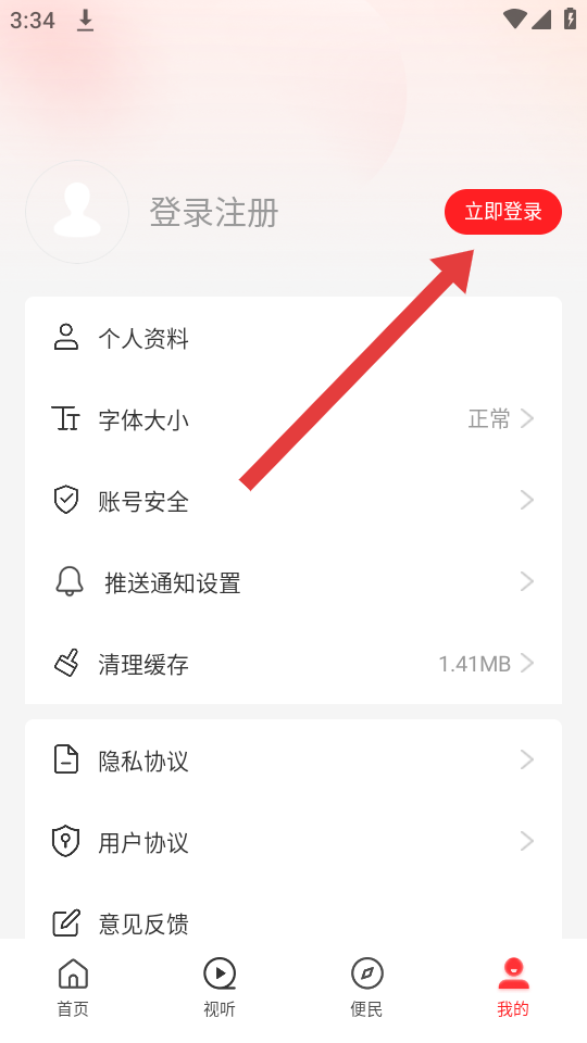 1、打開云上盧氏客戶端,點擊底部導航欄的我的,進入個人中心頁面,再點擊右上角的立即登錄按鈕,進入登錄界面。