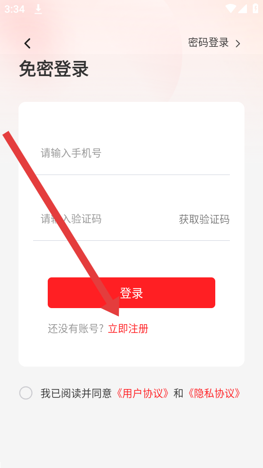 2、在個人中心頁面的登錄界面,這里需要點擊還沒有賬號,立即注冊的選項,跳轉至注冊頁面。
