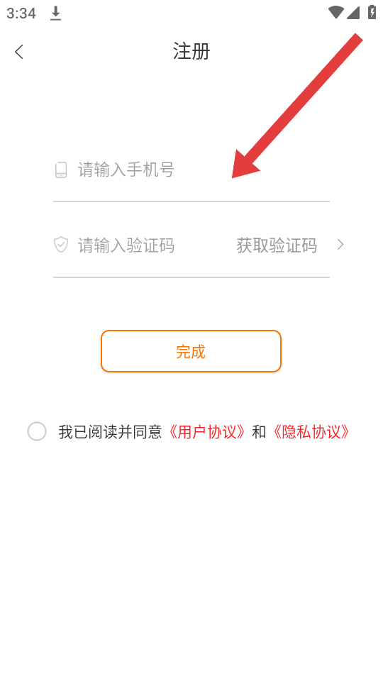 3、在注冊頁面,依次輸入手機號碼、獲取并填寫驗證碼,勾選我已閱讀并同意用戶協(xié)議和隱私協(xié)議,最后點擊完成按鈕完成注冊。