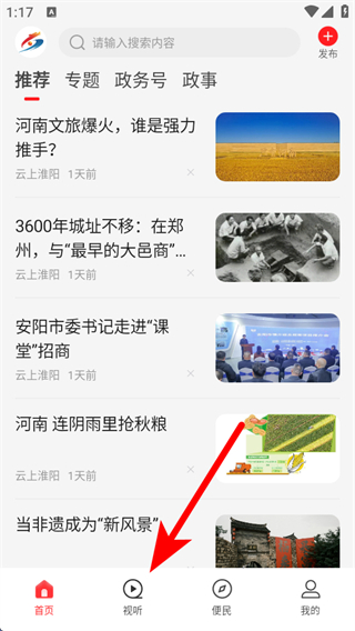 1、打開(kāi)云上淮陽(yáng)APP首頁(yè),點(diǎn)擊底部視聽(tīng),進(jìn)入視聽(tīng)頁(yè)面。