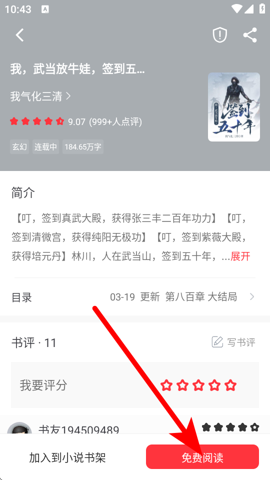 3、在小說詳情頁面,點擊免費閱讀按鈕,進(jìn)入小說閱讀界面。