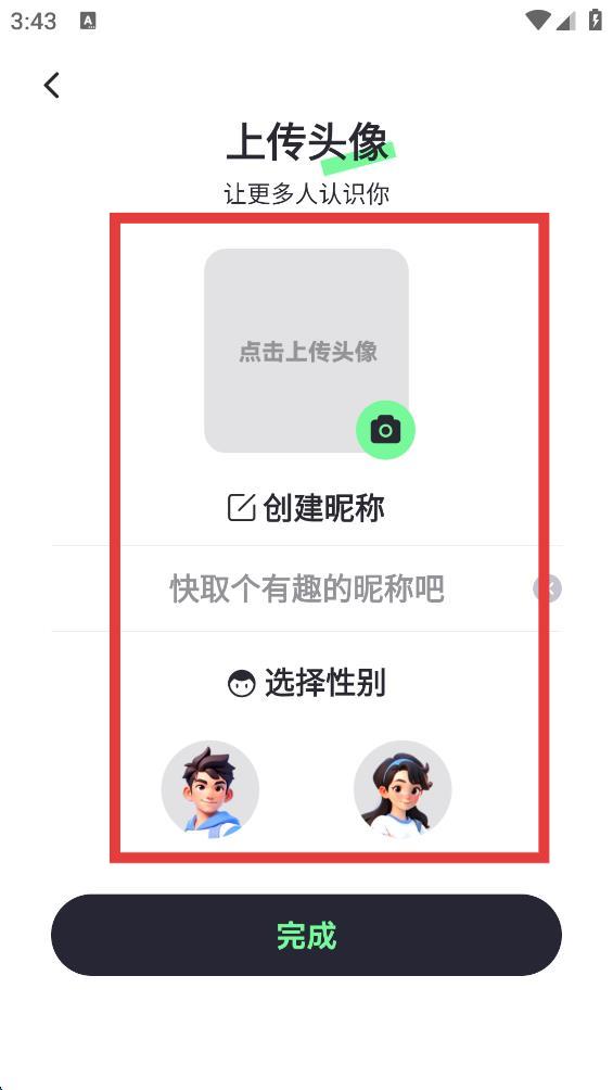 3、在上傳頭像頁面,完成上傳頭像、創(chuàng)建昵稱、選擇性別操作后,點(diǎn)擊完成。