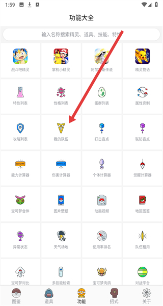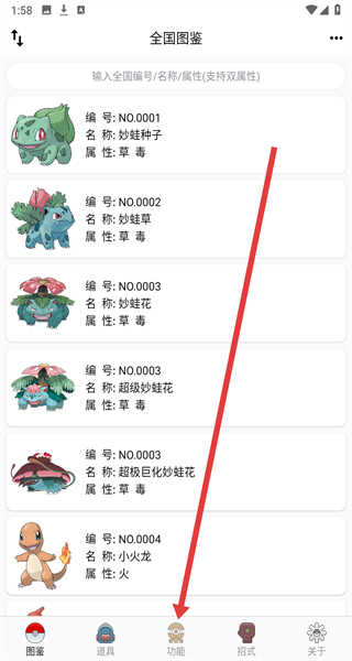 1、在“全國(guó)圖鑒”頁(yè)面點(diǎn)擊底部“功能”,進(jìn)入功能大全界面。