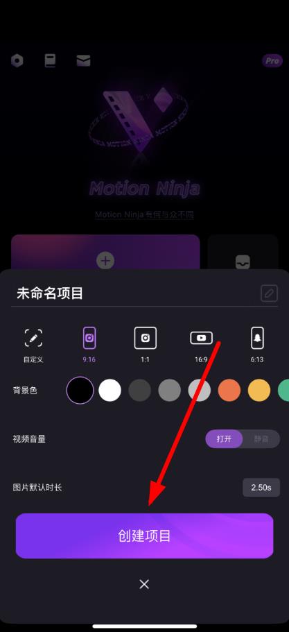 2、在彈出的項(xiàng)目設(shè)置界面,選擇視頻比例、背景色等參數(shù)后,點(diǎn)擊創(chuàng)建項(xiàng)目。