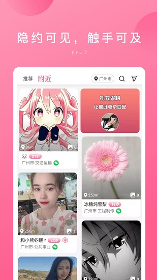 隱約是一個(gè)非常好用的手機(jī)在線交友互動(dòng)平臺(tái),平臺(tái)提供了多種精彩有趣的交友玩法,讓你交友脫單更加輕松,找到與自己志趣相投的朋友,隨時(shí)在線交友,在這里你可以看見諸多有趣的靈魂,給你一個(gè)全新的交友體驗(yàn),感興趣的朋友快來(lái)下載吧!