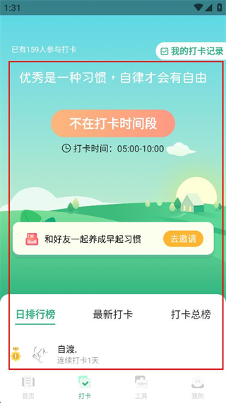 4、登錄后進入打卡頁面,可查看打卡時間段、排行榜等信息,參與打卡養(yǎng)成早起習慣。