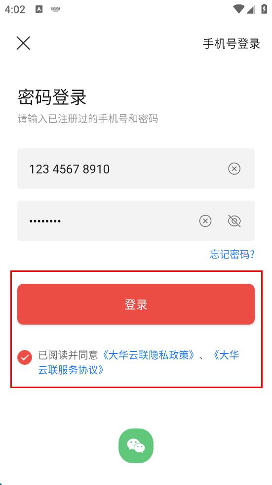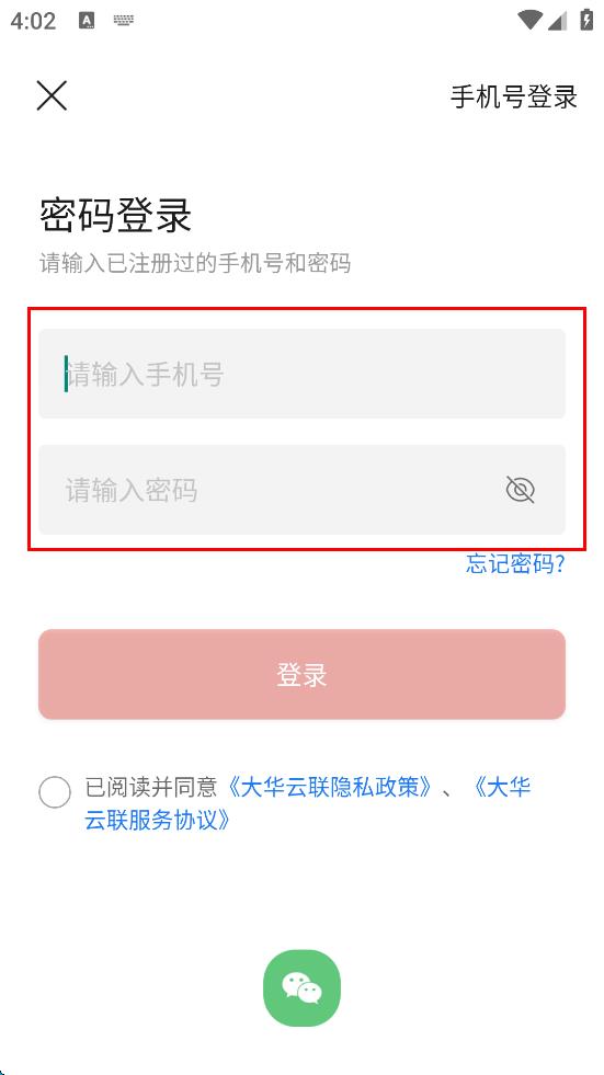 3、在密碼登錄界面,輸入手機(jī)號(hào)碼和密碼,勾選已閱讀并同意大華云聯(lián)隱私政策和大華云聯(lián)服務(wù)協(xié)議。