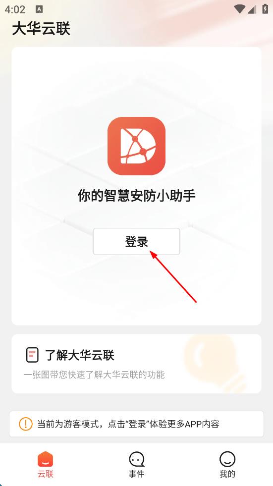 1、打開大華云聯(lián)APP,進(jìn)入主界面后,點(diǎn)擊登錄按鈕,進(jìn)入登錄頁面。