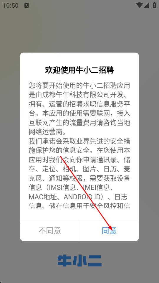1、打開牛小二招聘APP,在彈出的頁面點擊同意相關使用協(xié)議。