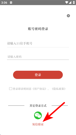3、在登錄的界面,選擇點(diǎn)擊短信驗(yàn)證,進(jìn)入短信登錄注冊(cè)頁(yè)面。