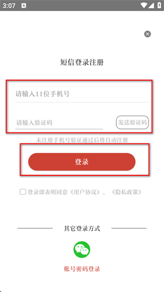 4、在頁(yè)面輸入手機(jī)號(hào)和驗(yàn)證碼后,點(diǎn)擊登錄未注冊(cè)的手機(jī)號(hào)將自動(dòng)完成注冊(cè)。