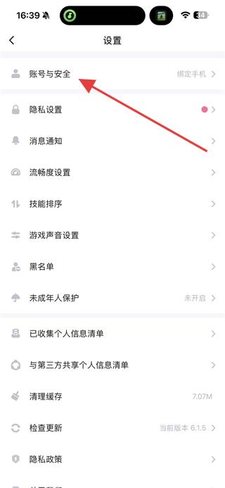 3、在設置頁面點擊賬號與安全,進入管理賬號安全相關功能的頁面。