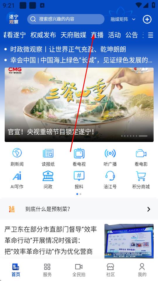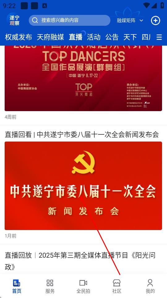 1、打開遂寧觀察App,點擊頂部導(dǎo)航欄直播選項。