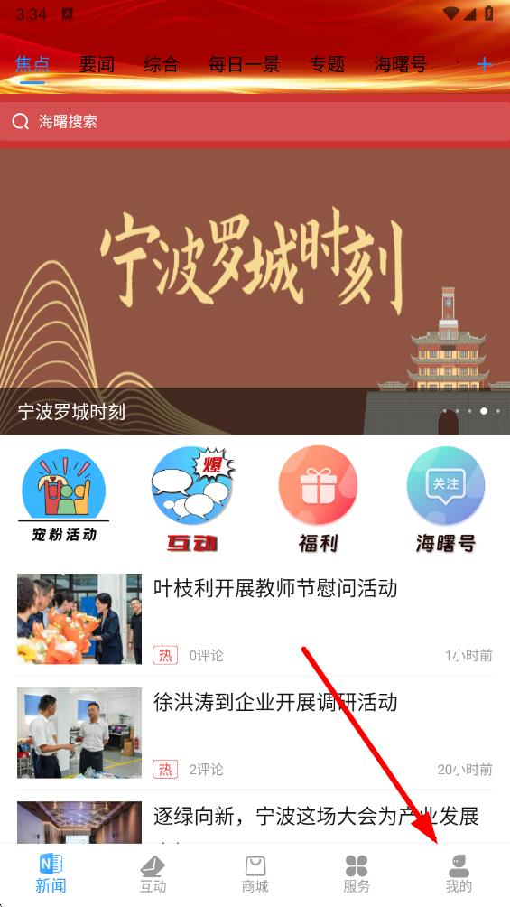 1、打開海曙新聞APP,點擊底部導航欄的我的,進入個人頁面。