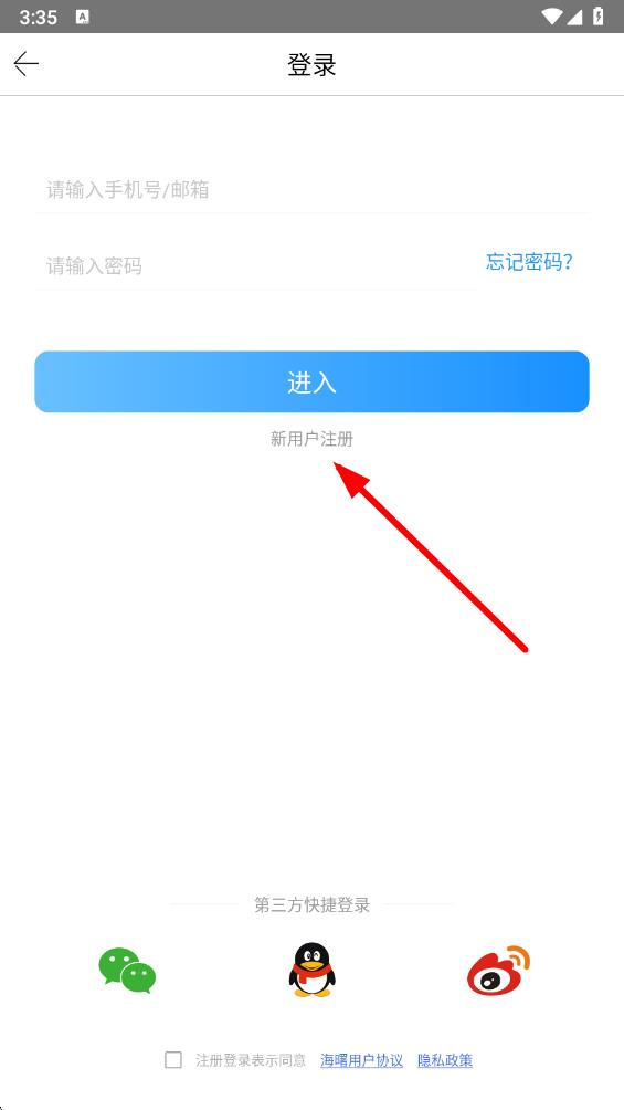 3、在登錄注冊界面,點擊新用戶注冊選項,進入注冊頁面。