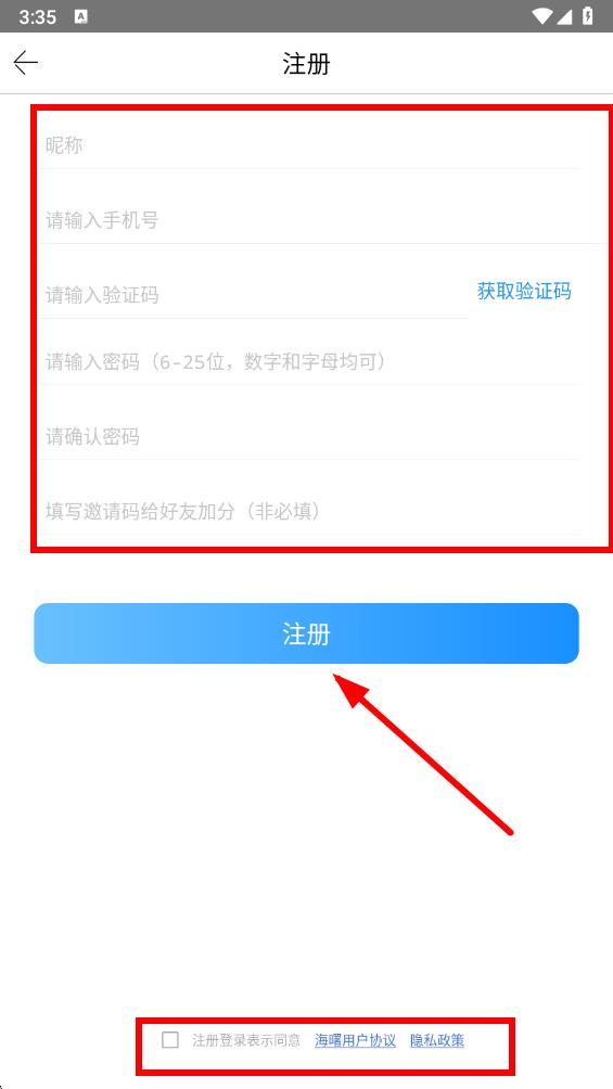4、在注冊頁面,依次填寫昵稱、手機號、驗證碼、密碼等信息,勾選同意相關協(xié)議后,點擊注冊按鈕,完成注冊流程。