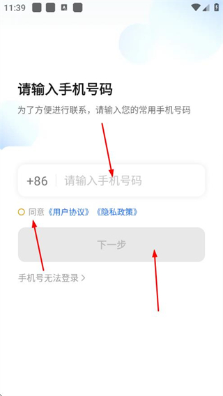 1、輸入手機號碼,勾選同意用戶協(xié)議,點擊下一步。