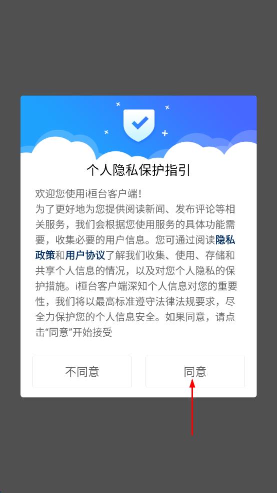 1、打開桓臺(tái)客戶端,出現(xiàn)個(gè)人隱私保護(hù)指引頁面,仔細(xì)查看后點(diǎn)擊“同意”按鈕。