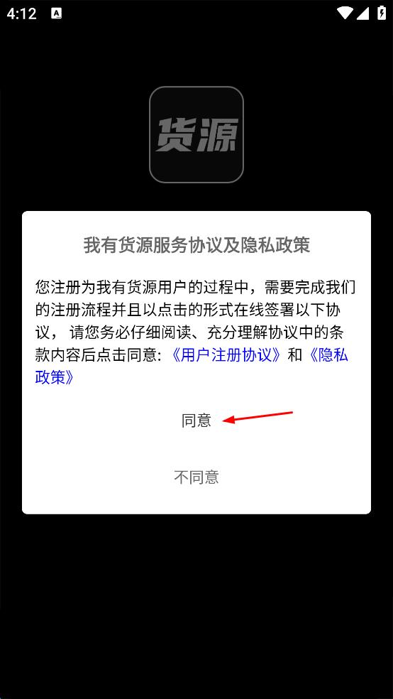 1、打開我有貨源App,出現(xiàn)服務(wù)協(xié)議及隱私政策彈窗,閱讀后點擊同意按鈕。