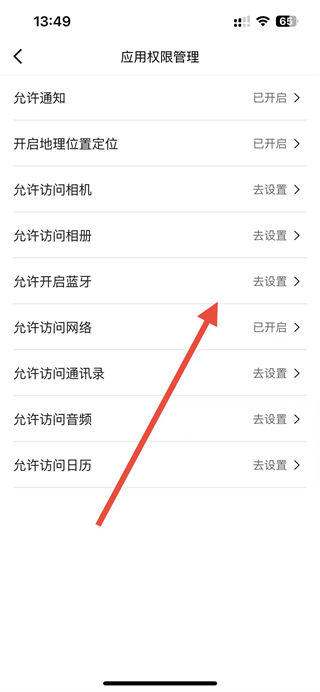 4、在應(yīng)用權(quán)限管理頁面,點(diǎn)擊對(duì)應(yīng)項(xiàng)右側(cè)的去設(shè)置或狀態(tài)區(qū)域,即可管理權(quán)限的開啟與關(guān)閉。