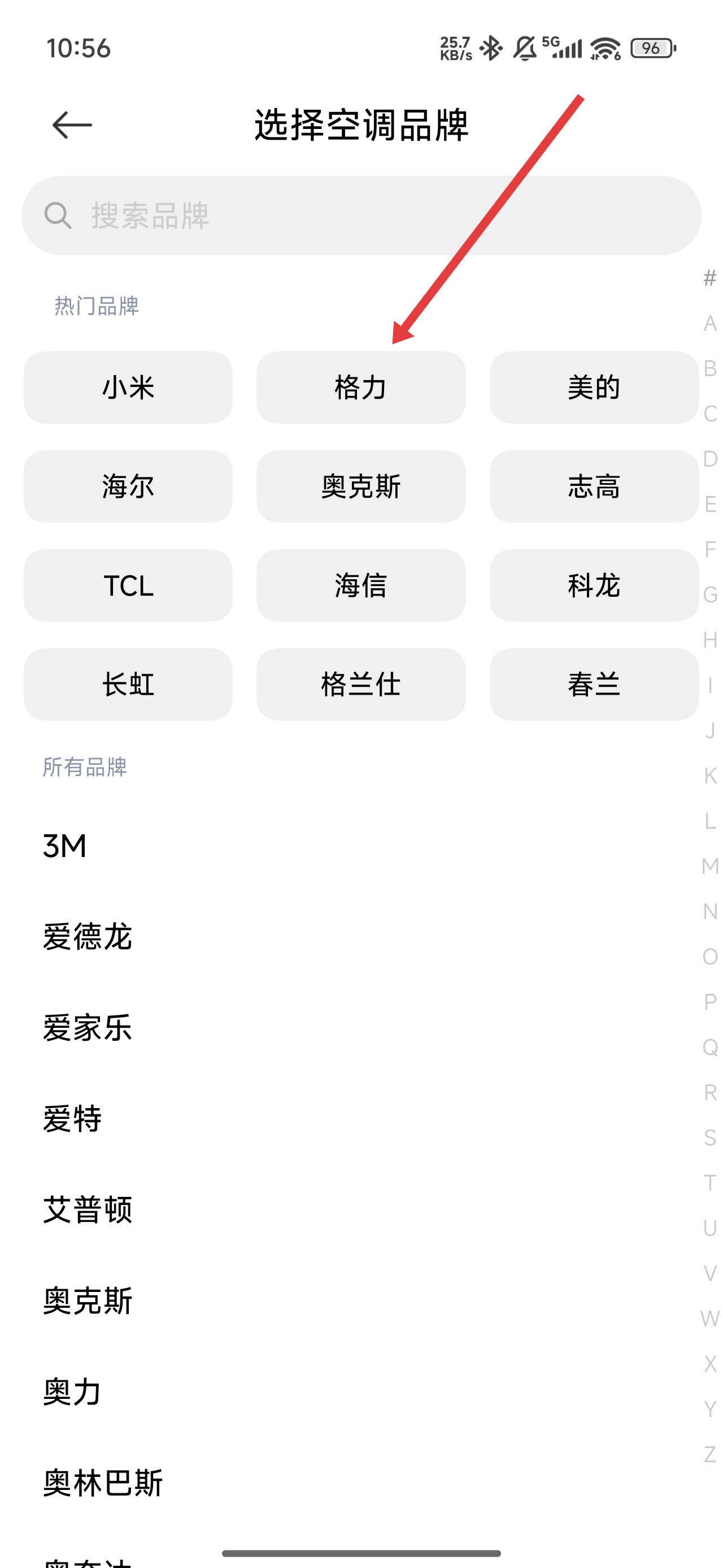 3、在進(jìn)入到空調(diào)品牌頁面中,選擇點(diǎn)擊格力進(jìn)行添加該款式遙控器。