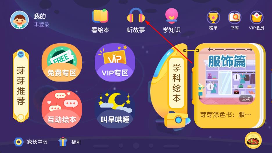 1、打開懶人聽書兒童版App,點(diǎn)擊主界面中的聽故事選項(xiàng)。